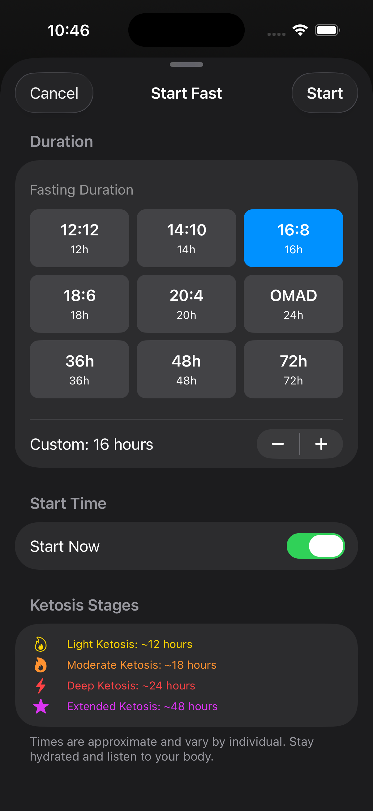 Tap to previewFasting timer with ketosis stage tracking. Multiple preset durations from 12h to 72h.